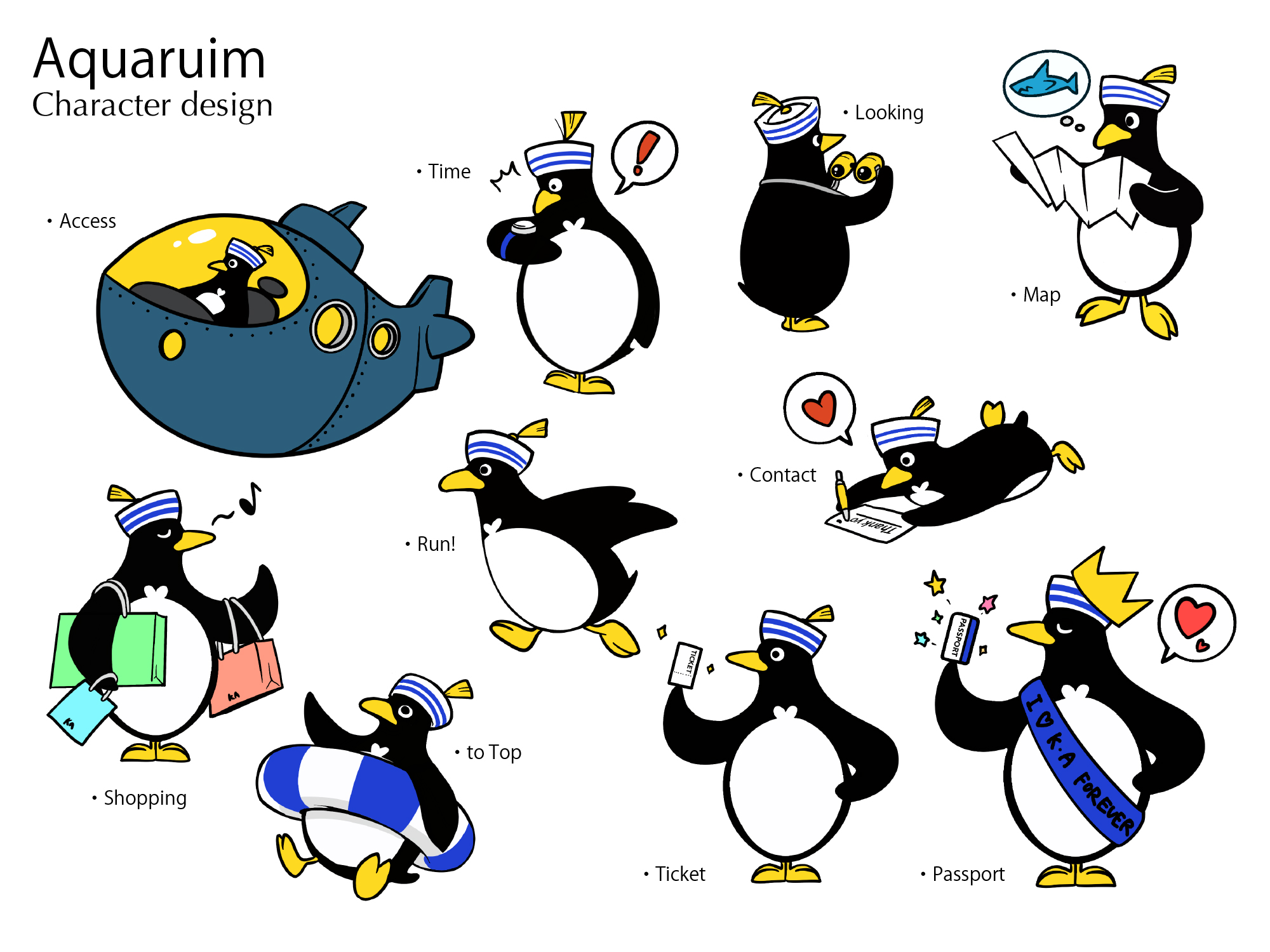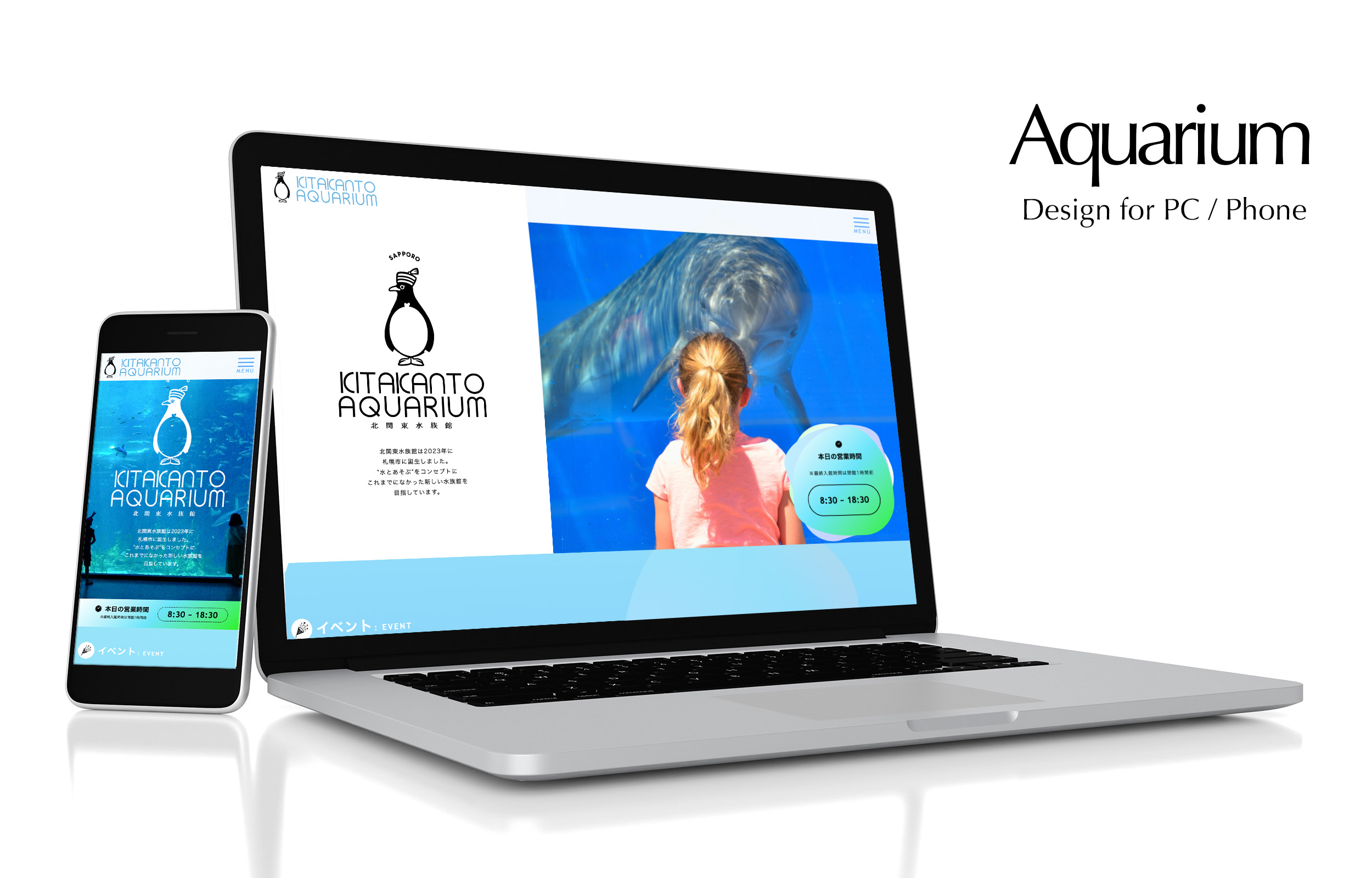 CONCEPT : 20~40代がメインターゲットに据えた設定の水族館なので、親しみやすいキャラクター“きぃくん”を作成し、各ページにも配置。柔らかい印象のサイトにするため曲線を多用。背景はグラデーションと上昇するような泡をさりげなく配置し深海を表現。