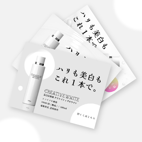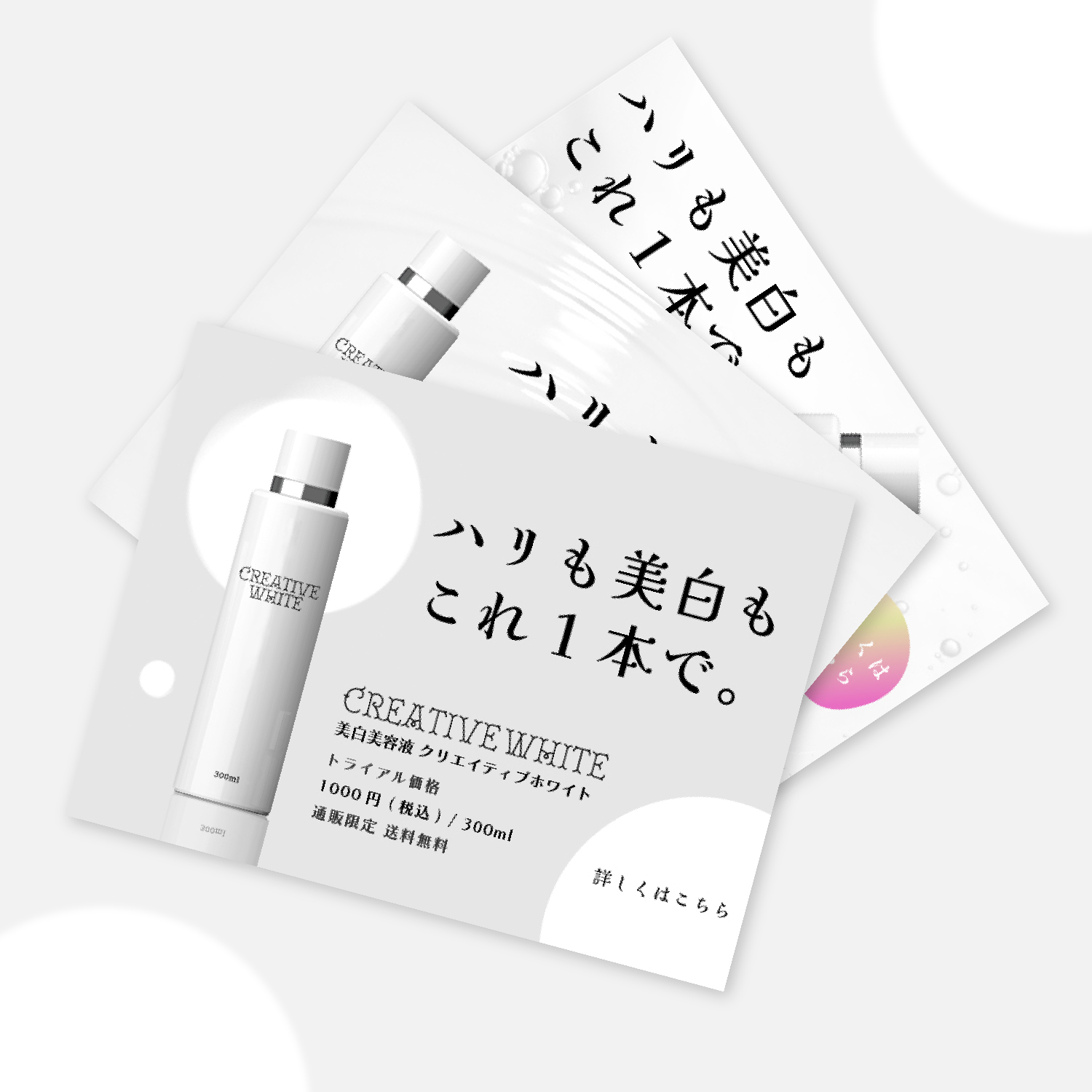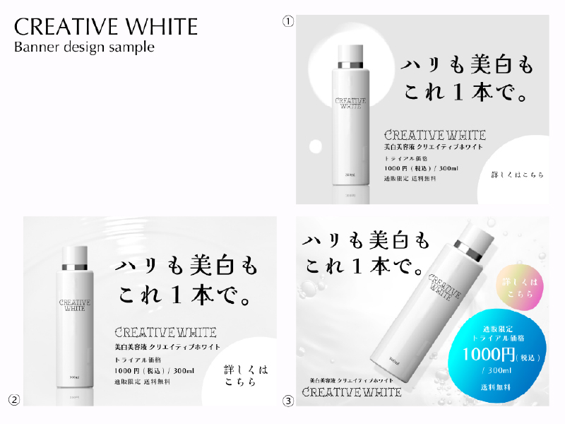 CONCEPT : “美白”をイメージさせるめに白とグレーをメインにし、背景には波紋などの水の要素を配置しクリーンな印象に。パターン③はすぐに広告に目が行くようにグラデーションを使用。